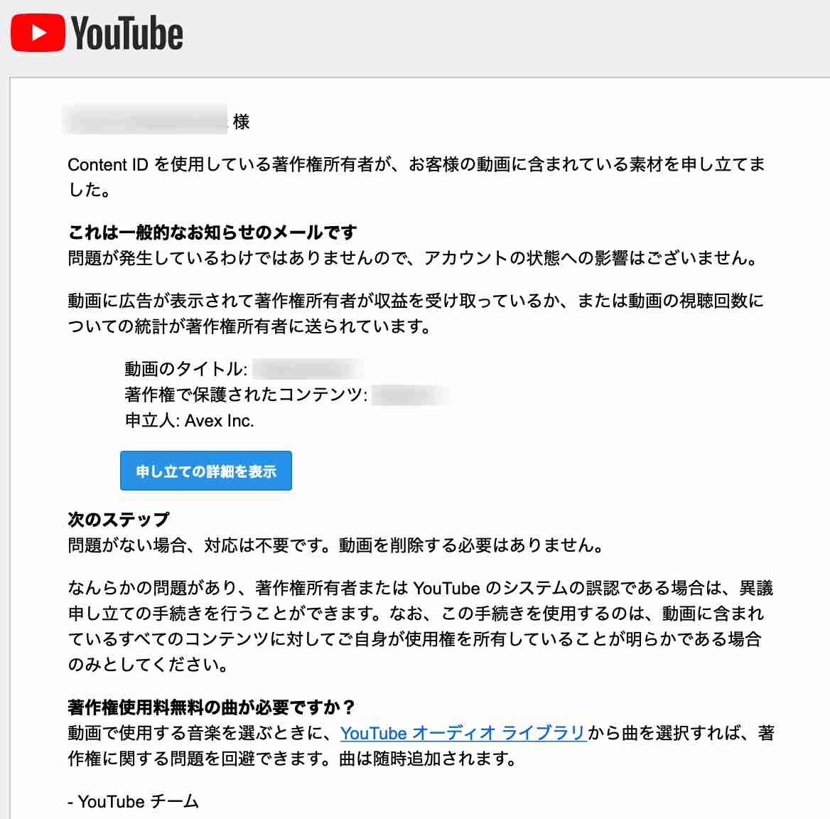 こちらは動画をアップロードして公開していた際に、Content IDが著作権保護されたコンテンツが含まれている事を検出して、自動でYoutubeから僕に送られたメールの内容です。